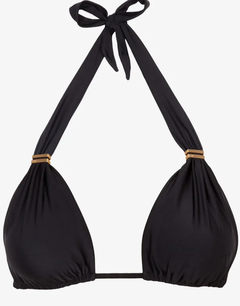 The Signature Bia Tube bikini top in classic black with 24-karat gold-plated adjustable sliding tube detail. Removable cups contour the bust for a flattering shape, while the tie halter neck and tie back give the perfect fit. Complete the look with the matching Vix Signature Bia Tube pant in black.