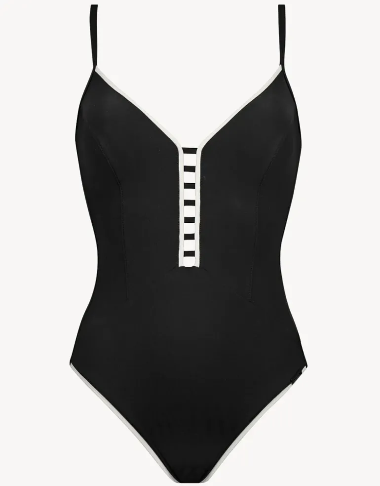 The Silence Plunge swimsuit from Maryan Mehlhorn is a simple black style elevated by ladder detailing at the front piped with white and with matching white piping at the neckline and legs.