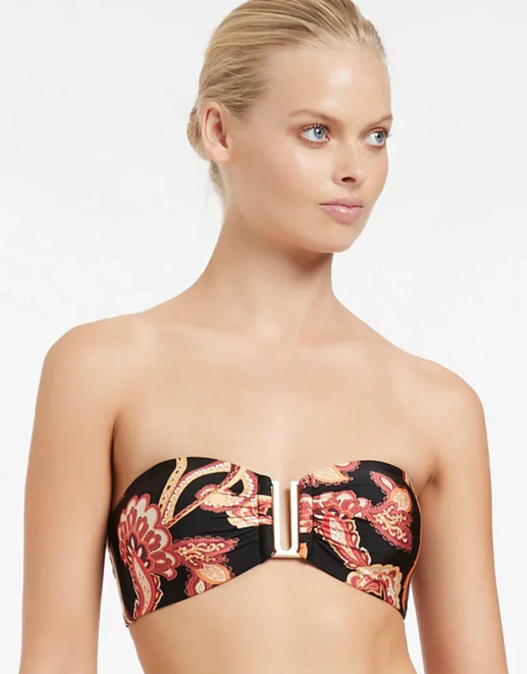 The Silk Road Bandeau bikini top from Jets is a beautiful clip back bandeau with removable cups, an adjustable removable strap and contemporary gold metallic U bar trim at the centre. It also has gripper tape for a secure fit.