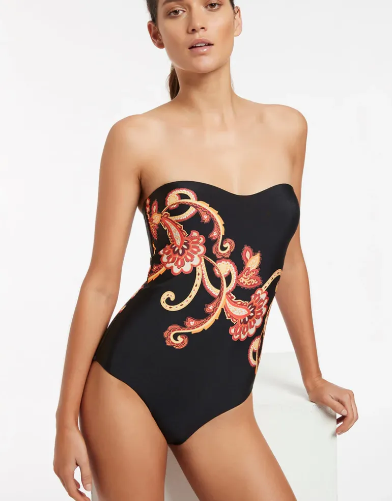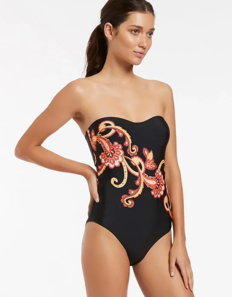 The Silk Road Bandeau swimsuit from Jets features the silk road print in a sash across the front and back. With infinity moulded cups and an optional strap.