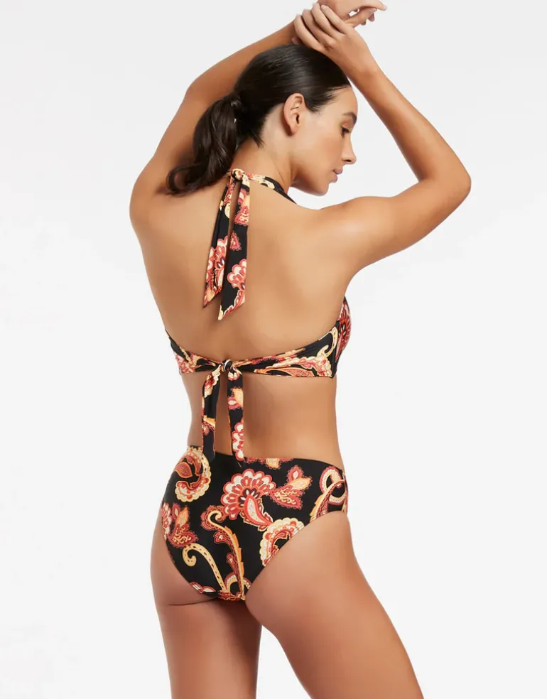 The Silk Road D-DD Halter bikini top is a classic halter shape with contemporary gold metallic U bar detail at the centre and wide halter straps and back ties. This top also has removable cups and is best suited for D and DD cup sizes.