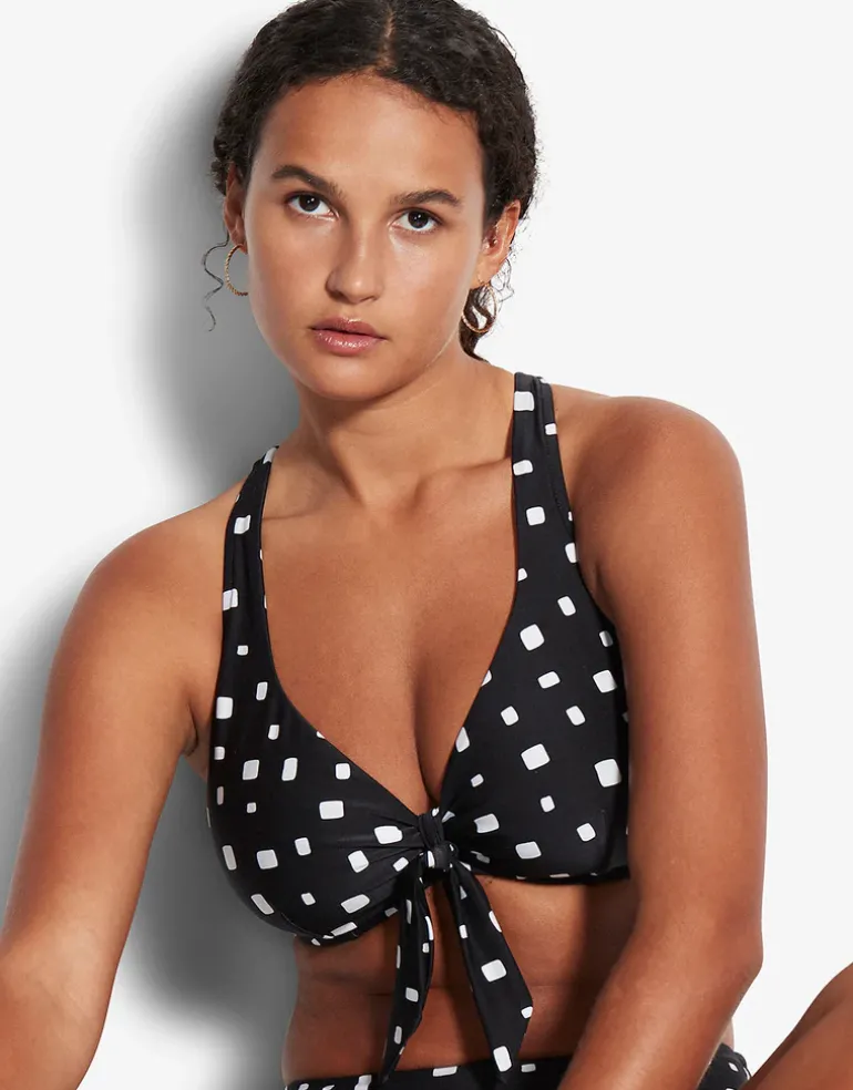 The Soft Spot F Cup bikini top from Seafolly is a structured bikini top with underwire and side boning, a multi-fit adjustable E-hook for a versatile fit, and adjustable convertible cross-back straps. With a lovely halter neckline, it also has a decorative tie at the centre.