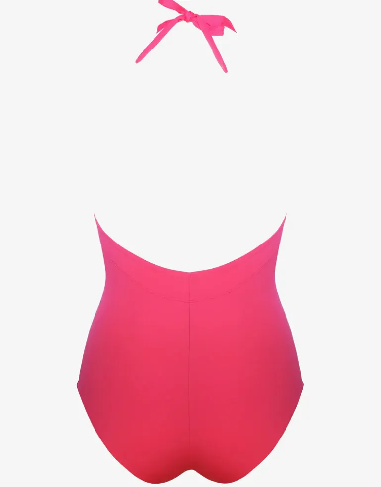 The Softline Plunge Halter swimsuit from Maryan Mehlhorn, in a vibrant pink watermelon hue, features a daring, deep plunging neckline elegantly tied at the neck in a halter style. Pintuck detailing on each side under the bust enhances the silhouette.