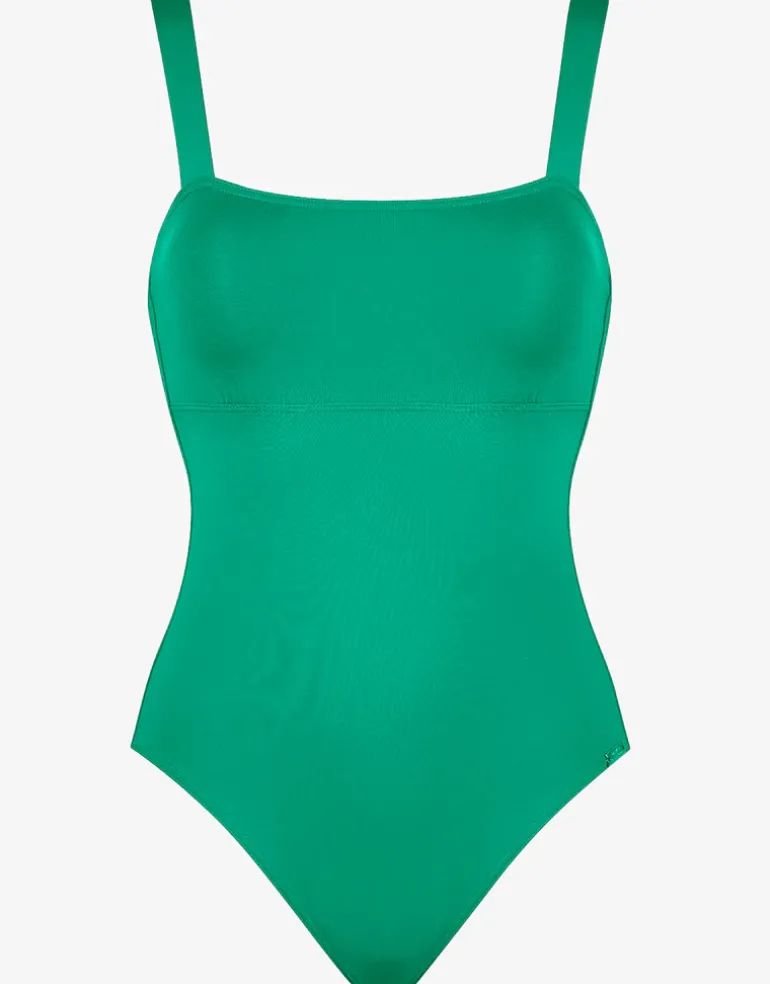 The Softline Square-Shaped swimsuit from Maryan Mehlhorn is a beautiful green style with wide straps and a square cut at the front and back.