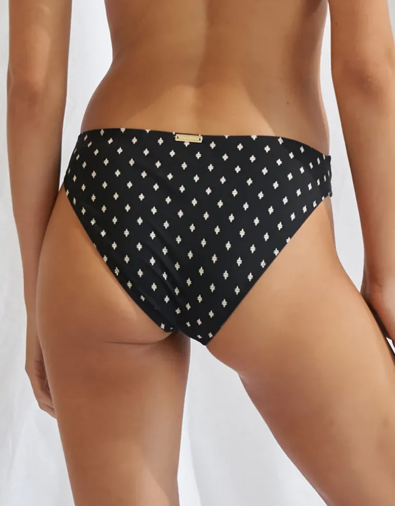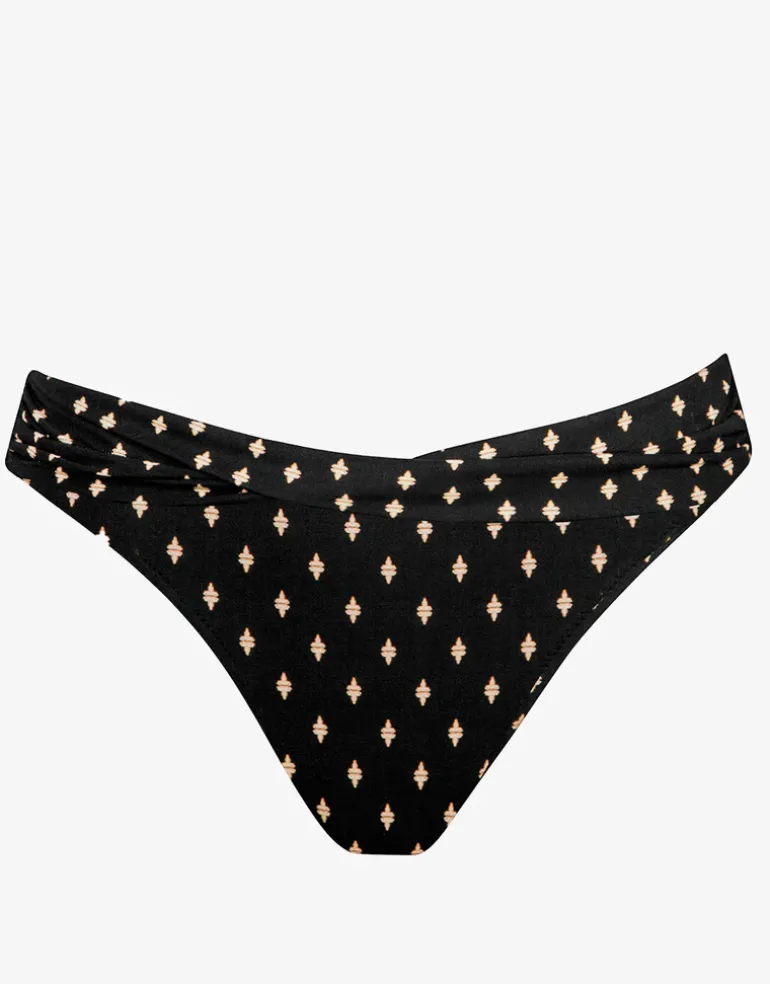 The Soul Spots bikini pant from Watercult is a lovely black and cream diamond spot print in a crossed front waistband pant with moderate coverage.