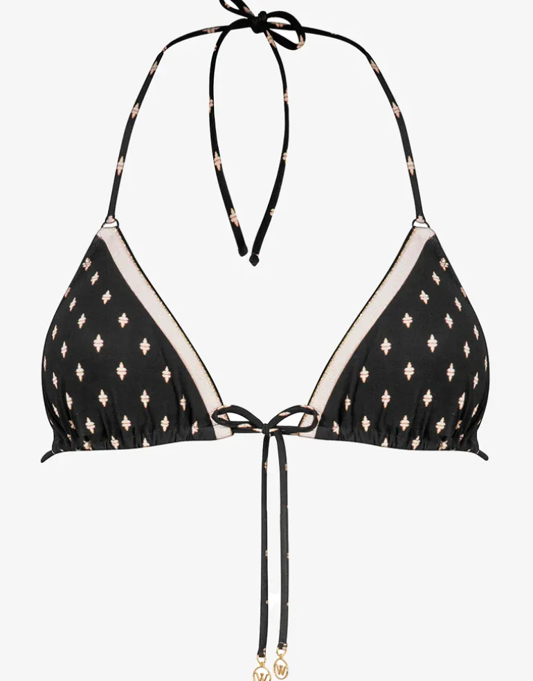 The Soul Spots Triangle bikini top from Watercult is a pretty black and cream diamond spot print with contrast cream and gold thread edging. This bikini top has removable cups and ties at the front and neck.