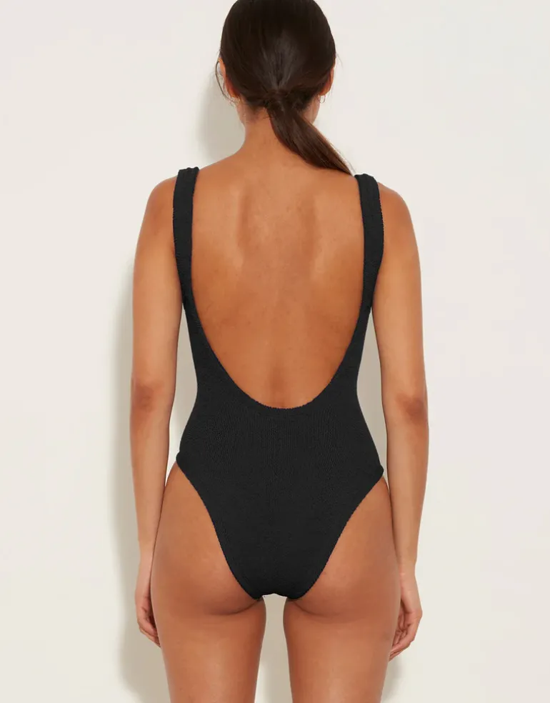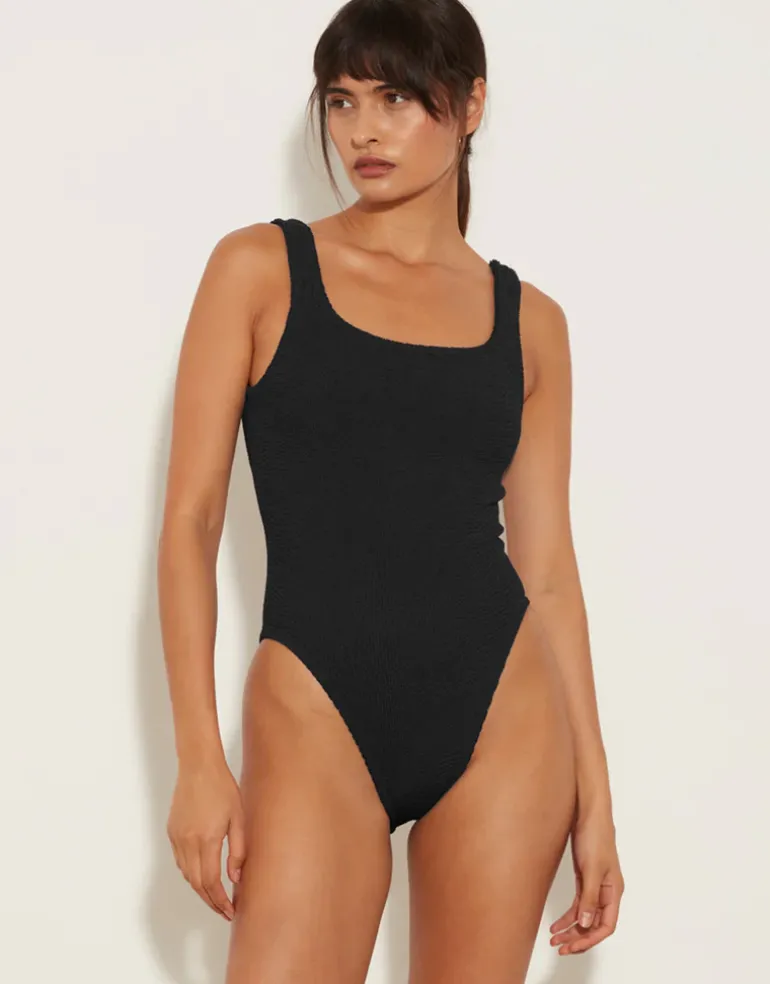The Square Neck swimsuit from Hunza G in classic black is a high leg, square neck style with low scoop back representing the brands 80’s heritage. Constructed from their smart Crinkle fabric which is designed to flex and sculpt to your body meaning that one size will fit sizes 6 to 16.