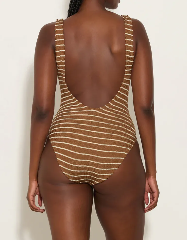 The Square Neck swimsuit from Hunza G in rich cocoa stripe with metallic sheen is a high leg, square neck style with low scoop back representing the brands 80’s heritage. Constructed from their smart Crinkle fabric which is designed to flex and sculpt to your body meaning that one size will fit sizes 6 to 16.