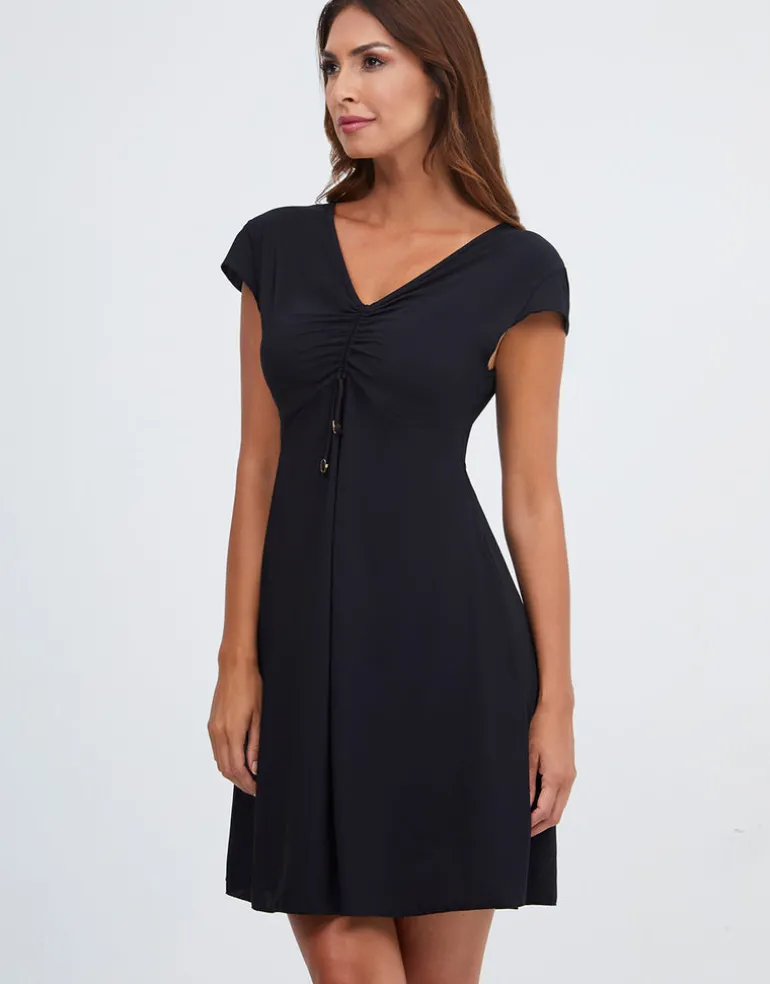 The Stella Beach dress from Nuria Ferrer is a simply mini-length beach dress made from swim fabric. With a V neck, capped sleeves and a gather with tie at the bust.