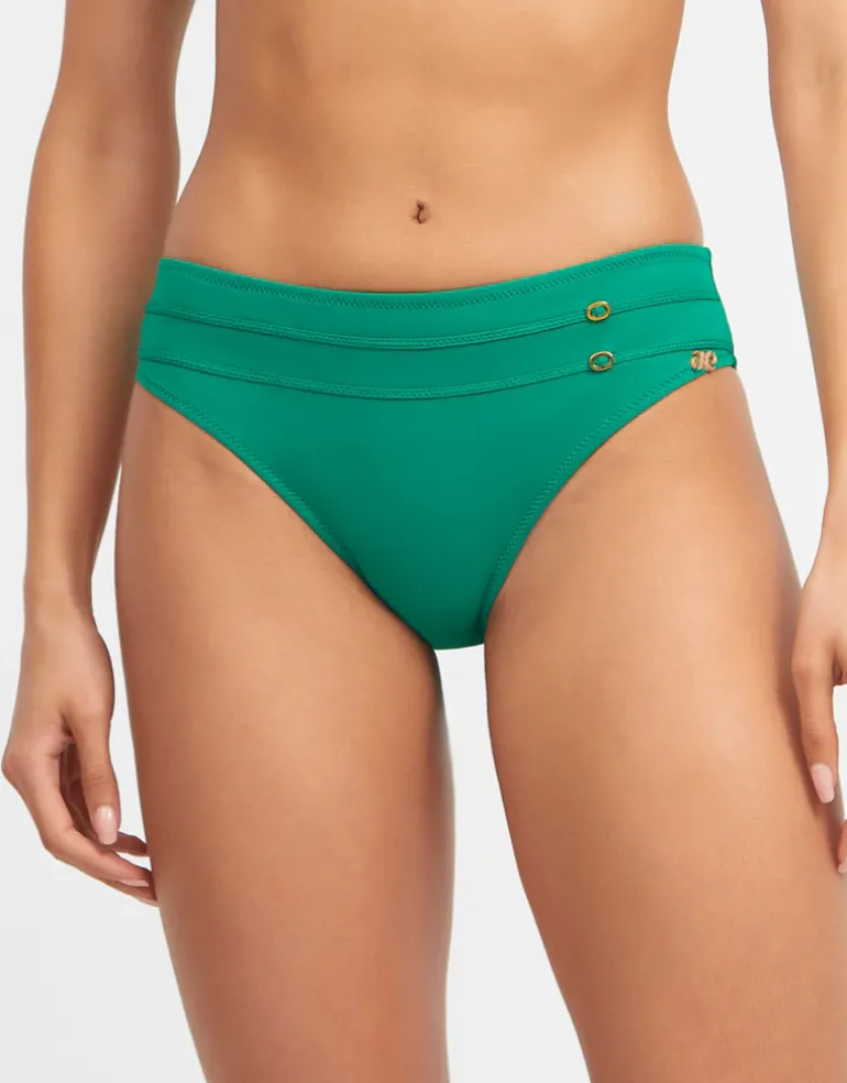 The Stella bikini pant from Nuria Ferrer in this beautiful green is a great moderate coverage style with pintuck and ring trim detailing at the front and tummy control.
