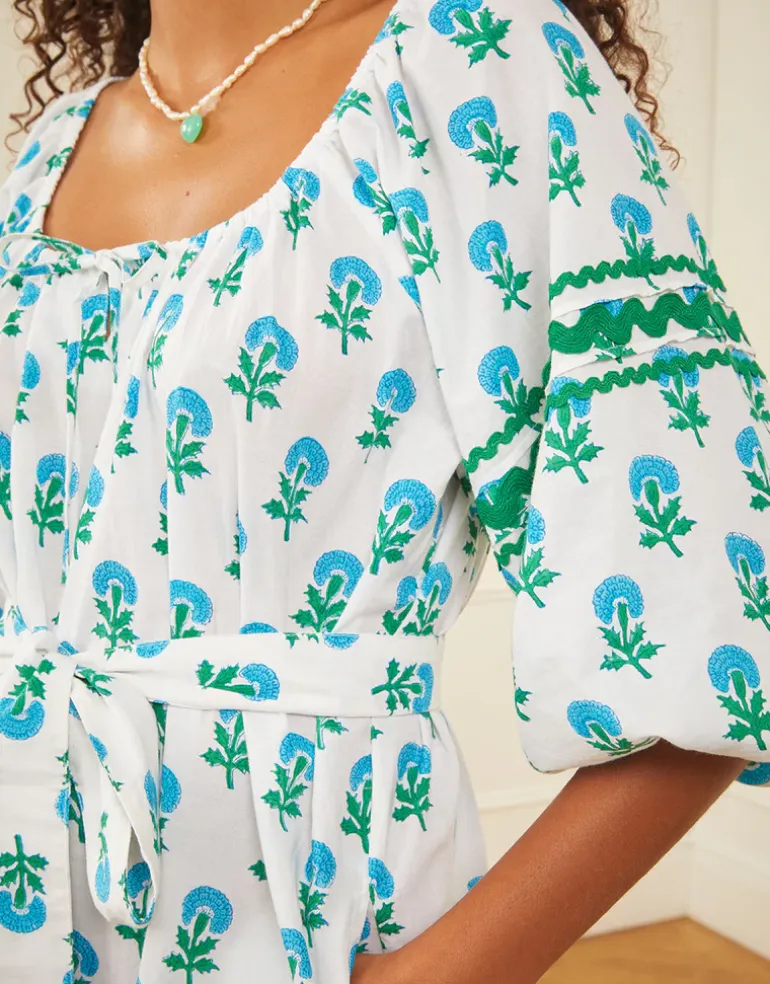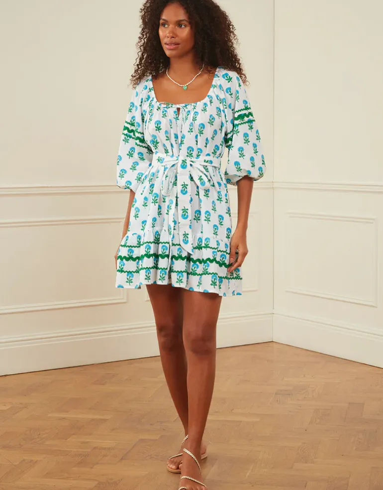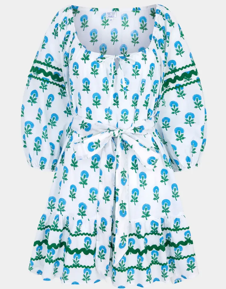 The Stella dress from Pink City Prints is a smock-style mini dress featuring airy three-quarter puff sleeves, adding a touch of romance to the silhouette. With a tie at the bust and a dropped hem, the Stella dress can be worn with or without a tie belt to create different looks, while pockets add functionality to the design.