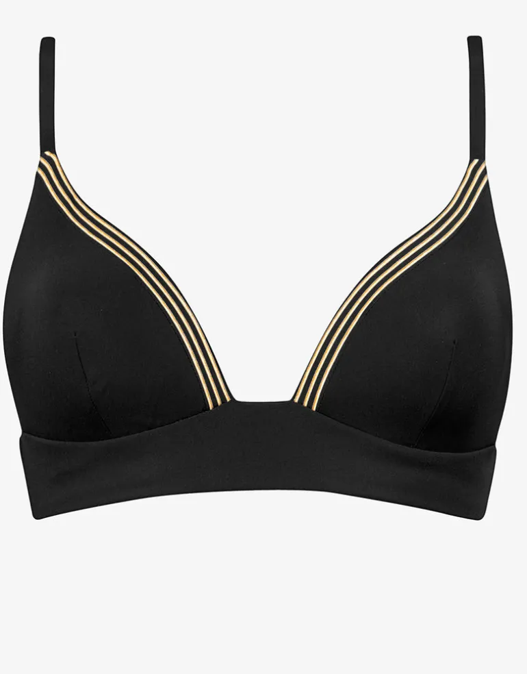 The Stratum Bralette bikini top from Maryan Mehlhorn in understated black with gold stripes framing the neckline is a pretty bralette style with a wide under-band, moulded cups and narrow, adjustable straps.