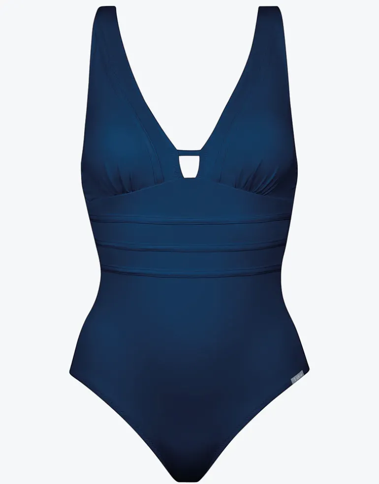 The Summer Dive Moulded swimsuit from Lidea in this lovely dark Sea blue colour is a flattering, deep plunge style with a tab joining the cups and three horizontal seams across the tummy. With moulded cups and removable and adjustable straps.