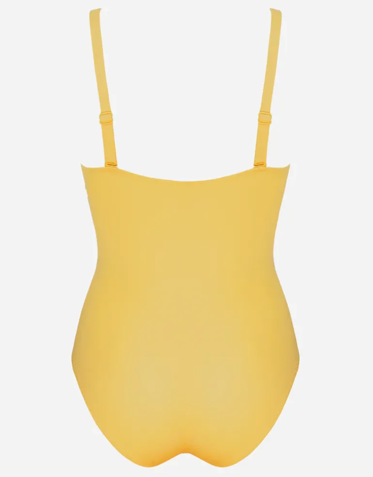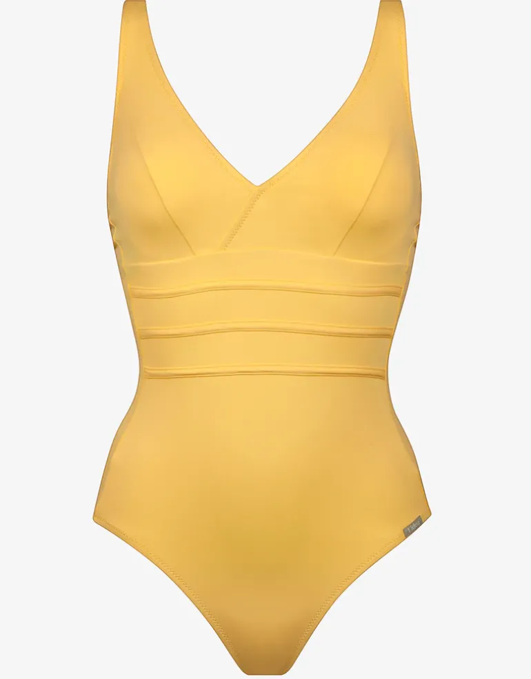 The Summer Dive Underwired V Neck swimsuit from Lidea is a gorgeous bright yellow style with a V shaped neckline and three horizontal seams across the tummy. The back is cut straight and the adjustable straps can also be crossed at the back.