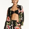 The Sundown Beach shirt from Sea Level is a beautiful oversized floral print on black beach shirt with long sleeves, a collar and button through front.