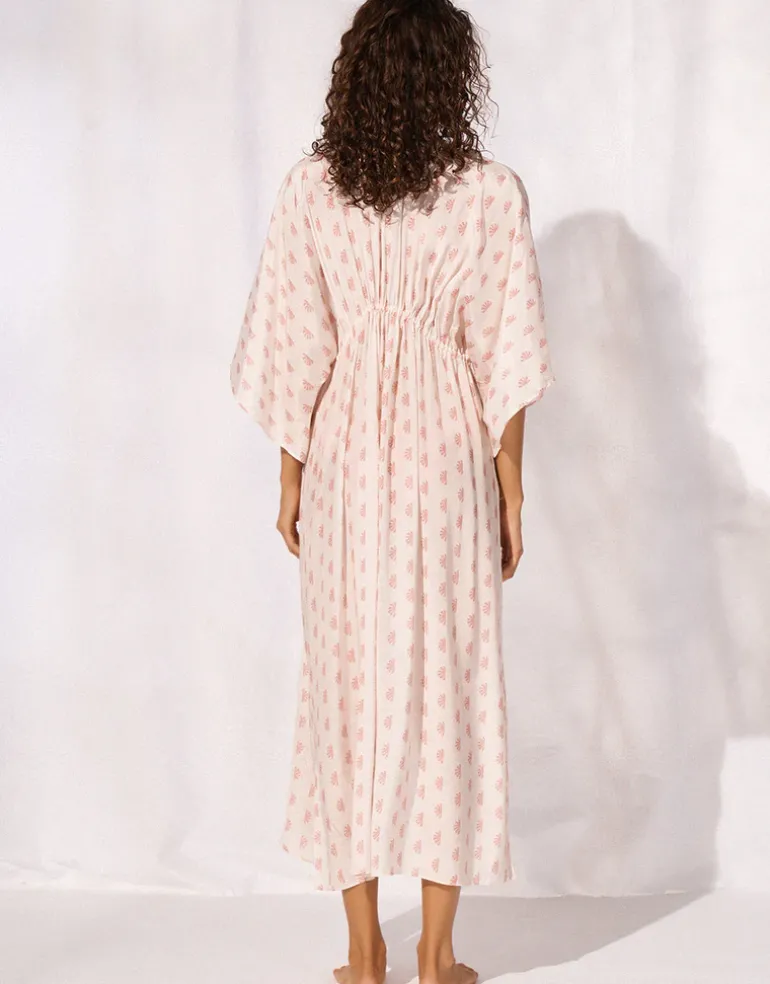 The Swimsparkle Midi kaftan from Watercult comes in this beautiful white and sunset glow muted pink print with a soft sparkle thanks to metallic threads woven through. With a flattering, plunging v-neck, and gathered waist which can be worn open or buttoned up.