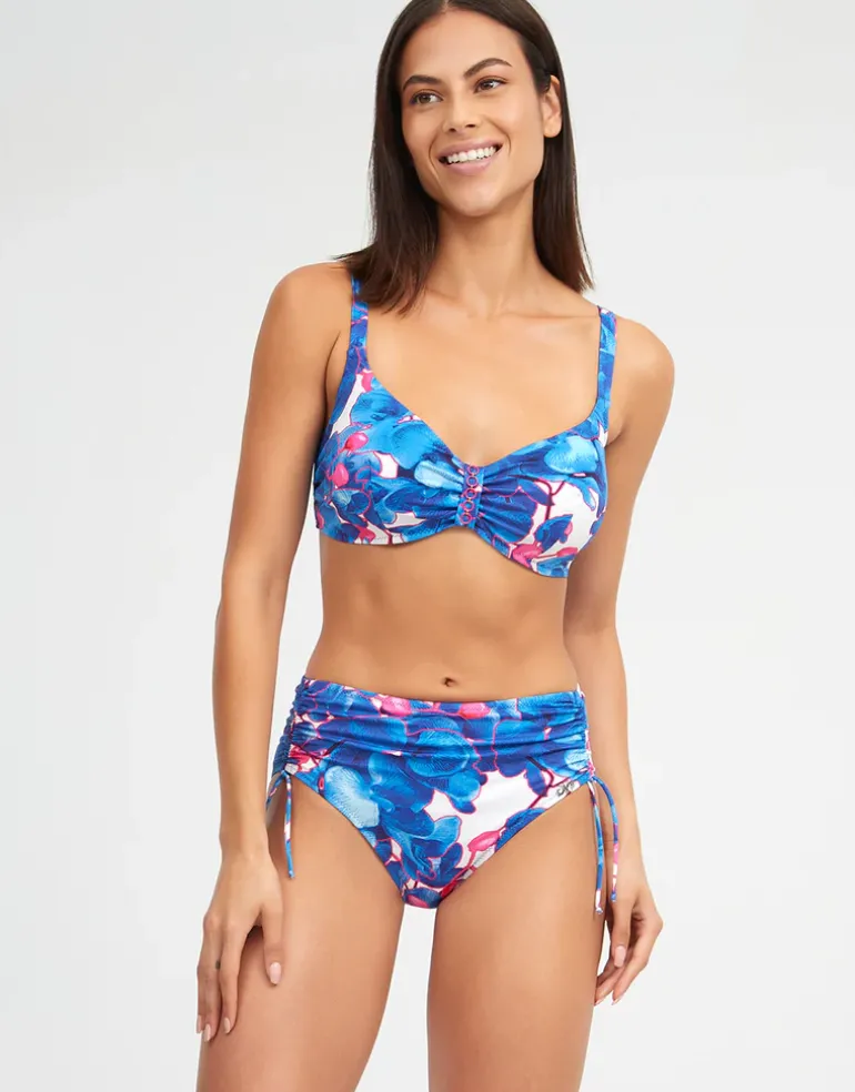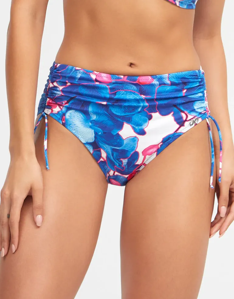 The Tahiti Maxi bikini pant from Nuria Ferrer in this bold blue, pink and white floral print is a full coverage, high waist pant with tie sides to adjust the leg height and medium tummy control.