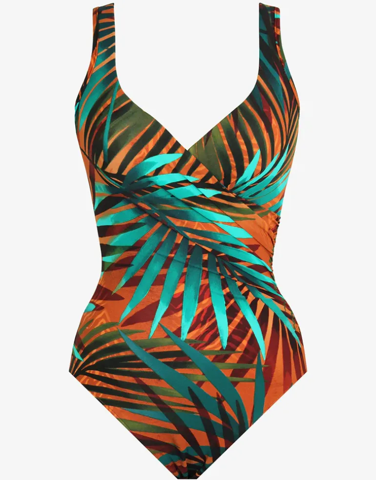 The Tamara Tigre It’s a Wrap swimsuit from Miraclesuit has a vibrant, brown and turquoise leaf allover print, with moulded underwired foam cups and comfortable wide straps and the design has a wrap at the front.