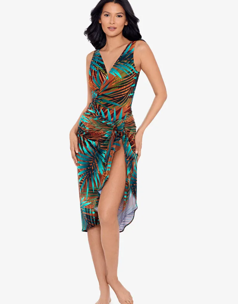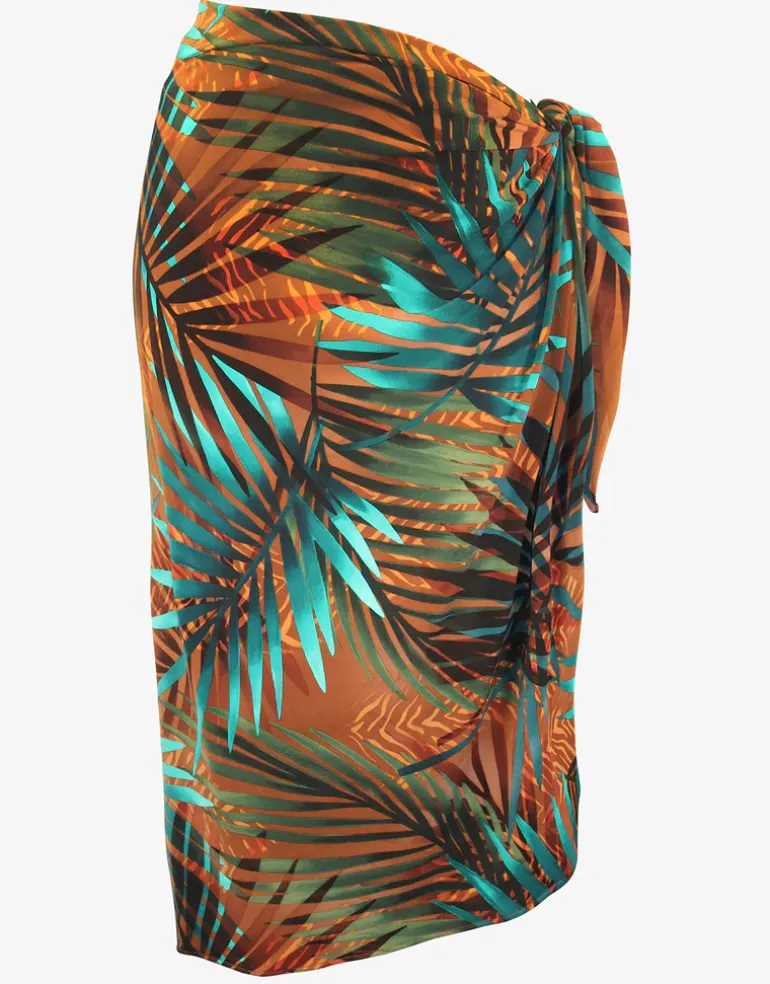 The Tamara Tigre Sarong from Miraclesuit has a beautiful vibrant, brown and turquoise tropical leaf design. This pretty sarong offers great coverage and a tie to one side.