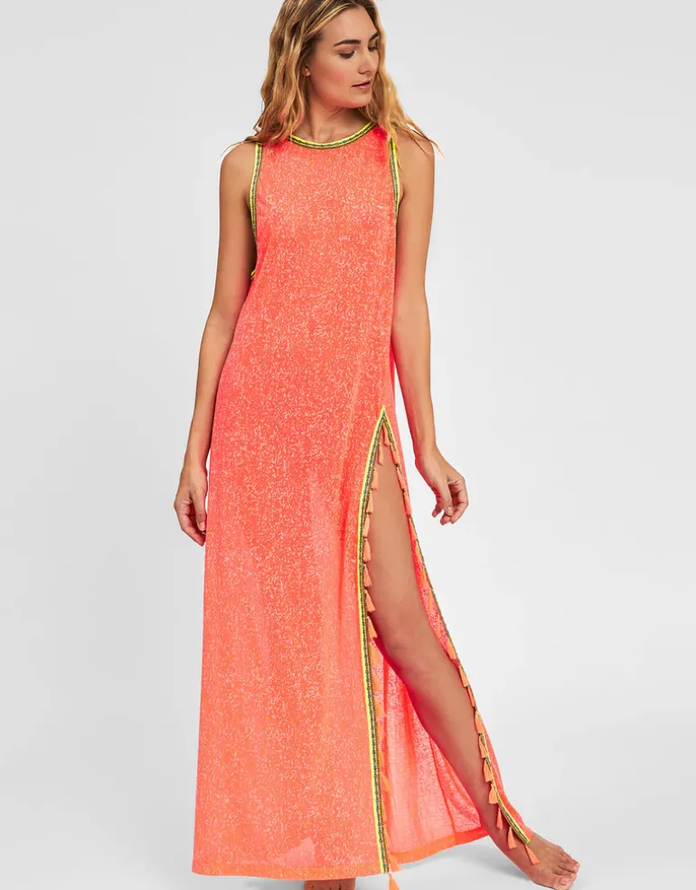 The Tassel Slit dress from Pitusa is a maxi length dress, high at the neck and with a thigh height slit to one side, finished with contrasting colour tassels. Available in Standard or Petite length. Choose Standard if you’re over 5ft 4in and Petite if you’re under.