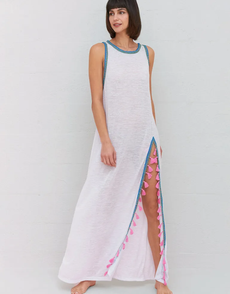 The Tassel Slit dress from Pitusa is a maxi length dress, high at the neck and with a thigh height slit to one side, finished with contrasting colour tassels. Available in Standard or Petite length. Choose Standard if you’re over 5ft 4in and Petite if you’re under.
