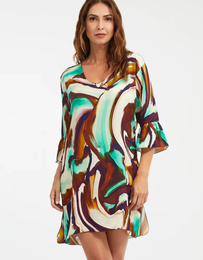 The Telma Dress by Nuria Ferrer is a V neck, mini-length dress in this bold brown and turquoise swirl print with elbow length, fluted sleeves.