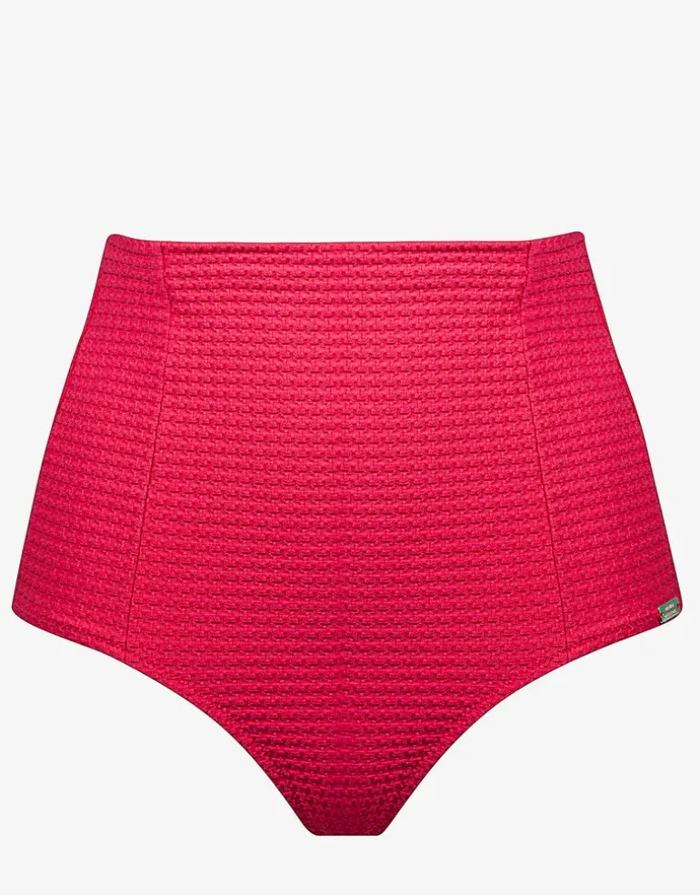 The Bloom High Waist bikini pant from Maryan Mehlhorn is made from a retro-modern houndstooth textured fabric in bright Radiant Red. This retro-look high waist style has a panelled front and moderate to low leg.