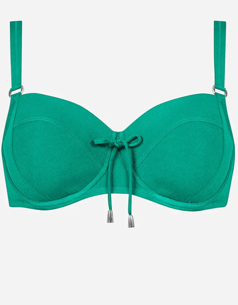 The Core Underwired bikini top from Lidea’s Core range is a lovely turquoise green colour structured bikini top with underwired moulded cups, a decorative tie at the centre, wide adjustable straps and a clip at the back.