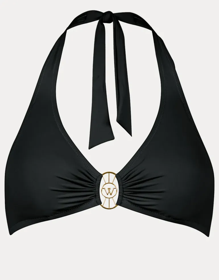 The The Essentials Halter bikini top from Watercult in classic black is a halter style that can be selected in a B and C cup for a great fit. This halter style has ties at the neck and back, removable moulded cups and a lovely gold metallic detail between the cups.