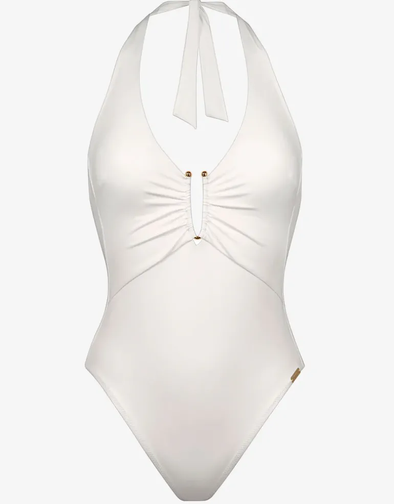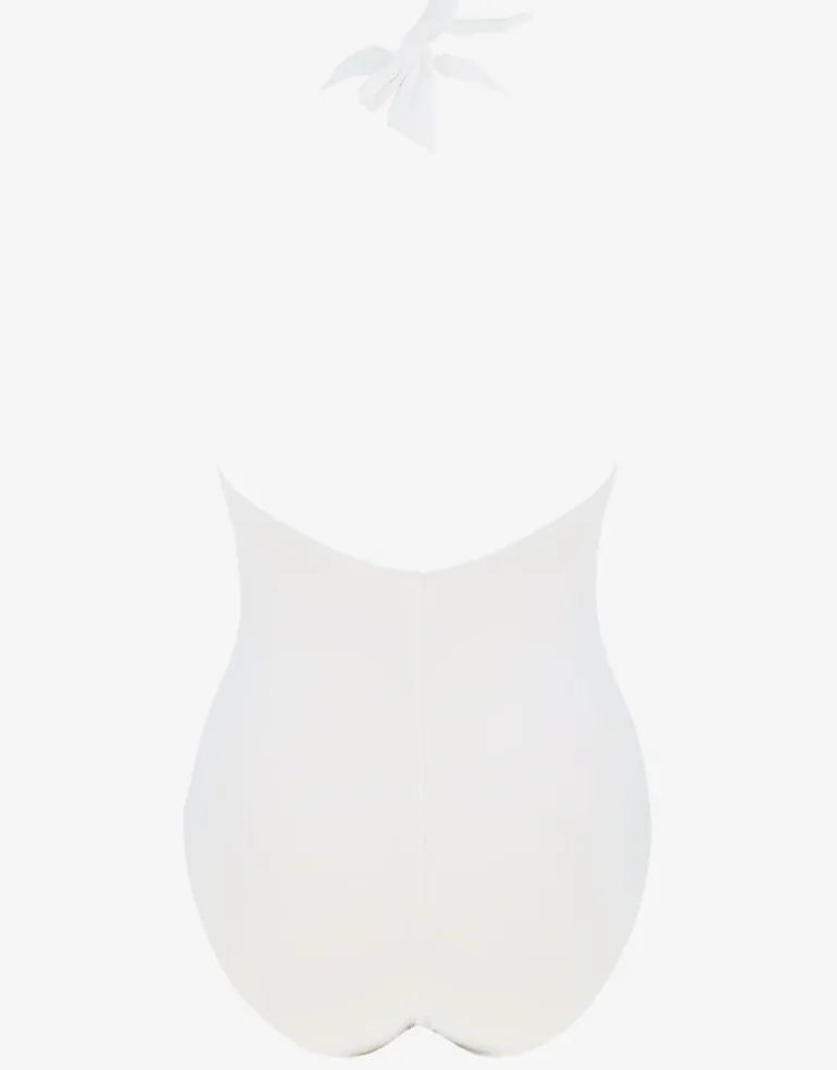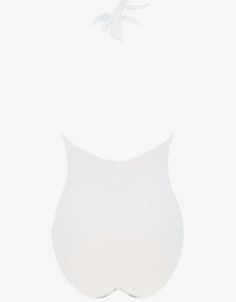 The White Collection Halter swimsuit from Maryan Mehlhorn is a fabulous white halter style with a large metallic U bar detail at the centre and bust gathers below. With removable cups and straps that tie at the neck, giving an open back look.