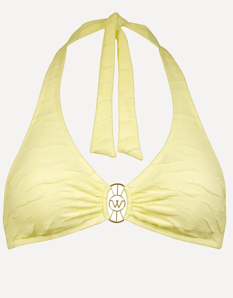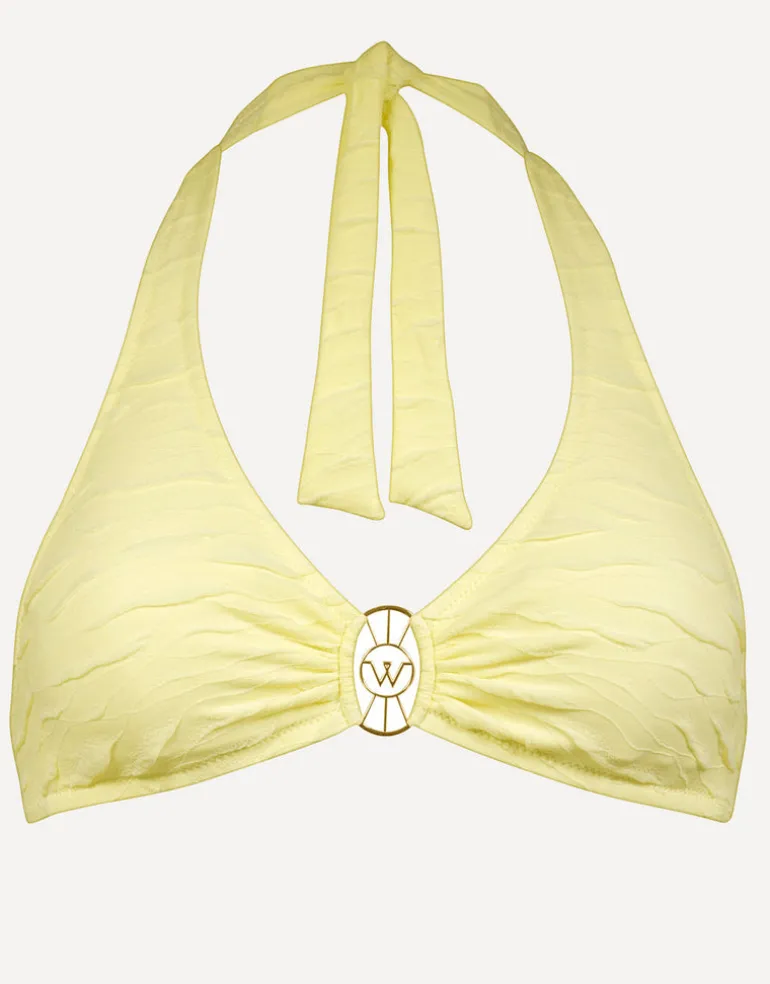 The Tidal Radiance Halter bikini top from Watercult in soft pastel Celestial yellow features a water ripple textured fabric for a simple but sophisticated look. This halter style bikini top offers removable moulded cups for shape, with ties at the neck and back for a customisable fit. A chic gold metallic logo between the cups completes the look.