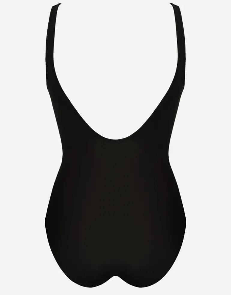 The Tobacco Fields Detail Front swimsuit from Charmline is a rich tobacco brown and black tile effect print with hints of denim blue. The neckline is a shaped V, bordered with solid black which continues to the navel and is adorned with gold metallic detailing. The back is black.