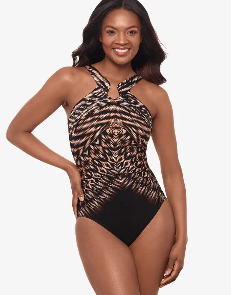 The Topkapi Aphrodite swimsuit from Miraclesuit in a striking digital design of tribal meets animal print is showcased by this angled neck silhouette that gives an illusion of a slimming, halter style. Completed with soft moulded cups, adjustable straps and all over body control.