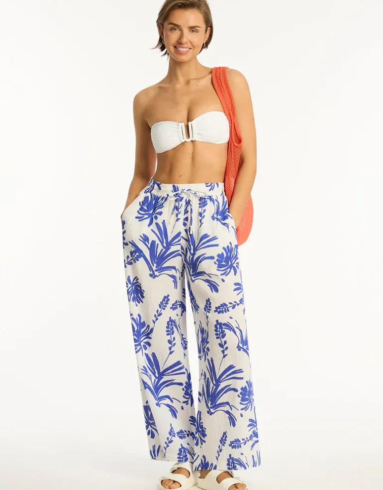 The Tradewind Beach Pant from Seal Level with cobalt blue floral print on a crisp white, are a wide leg beach trouser with an elasticated drawstring waist and side pockets.