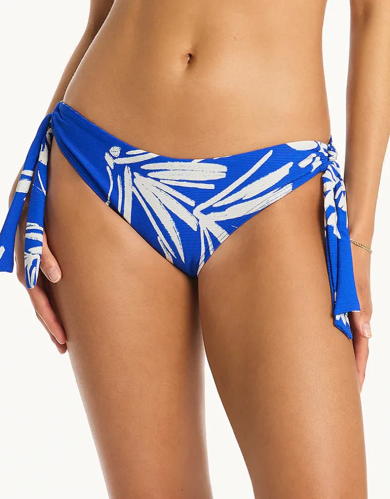 The Tradewind Tie Side bikini pant from Sea Level in blue and white botanical print is a medium coverage, tie side pant with a Powermesh lining.