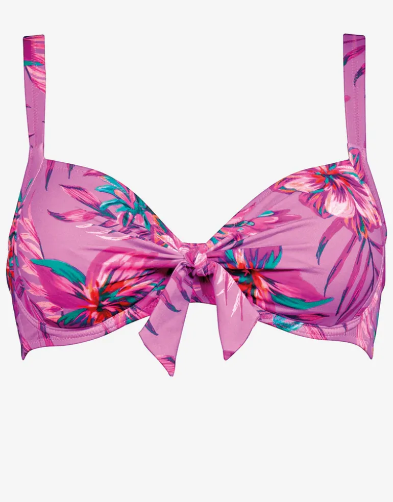 The Tropic Radiance Underwired bikini top from Lidea in a vibrant pink and green tropical print with hints of luminous shades of cantaloupe. With underwire support, a bow detail at the front and comfortable, adjustable straps.