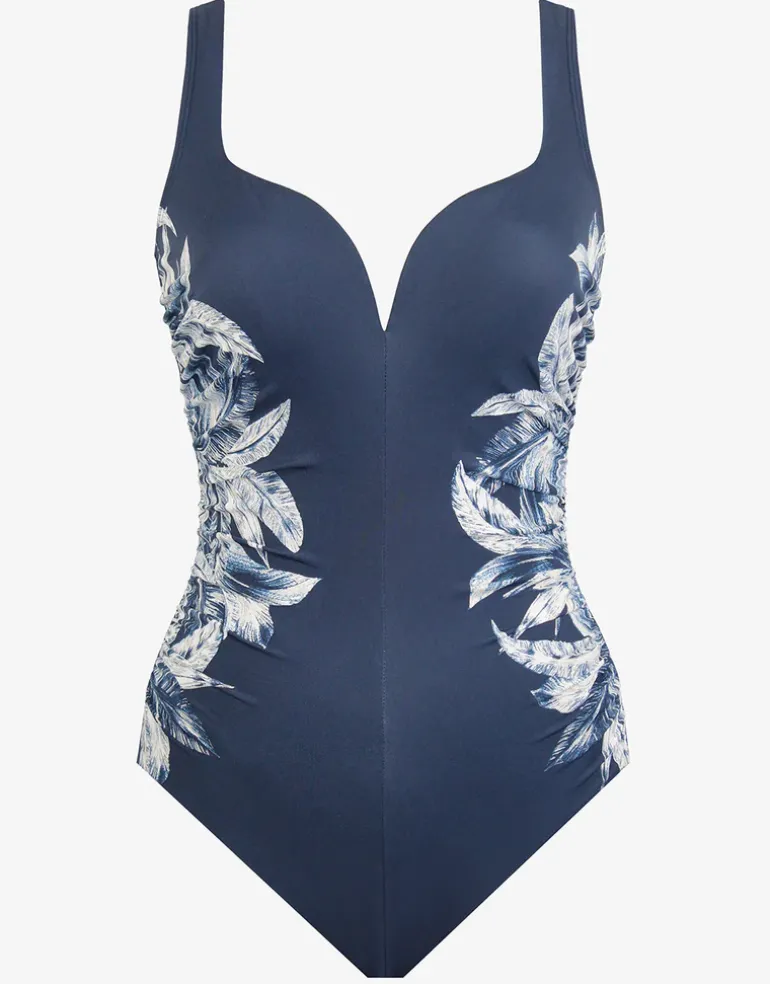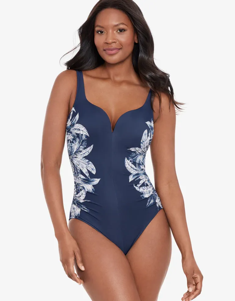 The Tropica Toile Temptress from Miraclesuit has a lovely shaped neckline in dark blue with white floral print to the sides giving a slimming effect. With soft cups and wide straps.