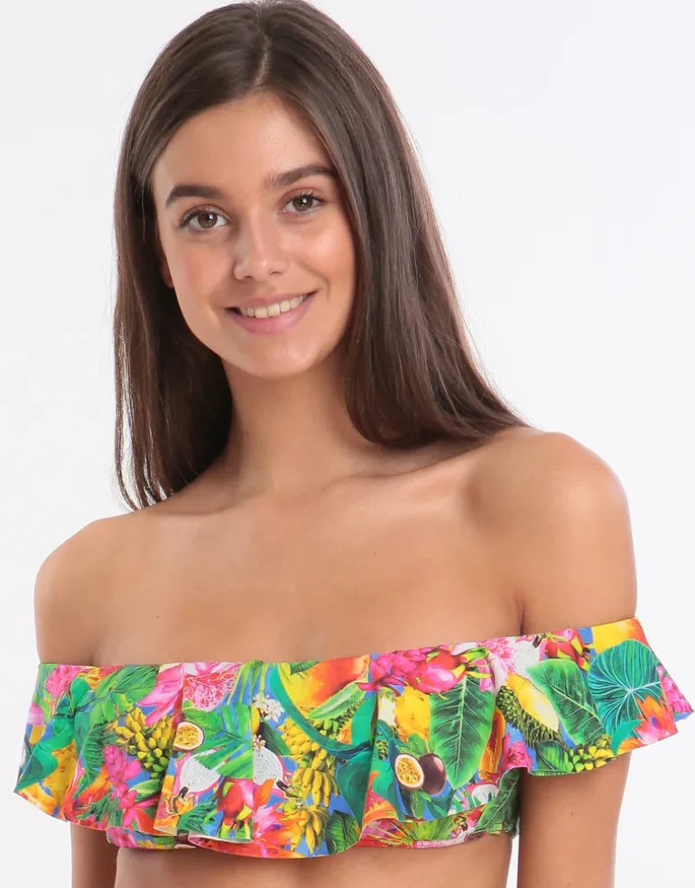 Make a statement in Banana Moon’s Tropicool Tolvo Off The Shoulder Bikini Top. With its strapless style and fun frilly edging, this bikini top is sure to impress and be your must-have style this holiday season.