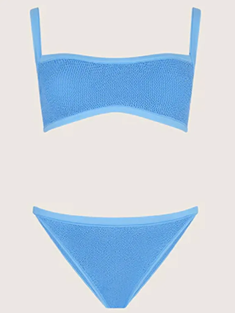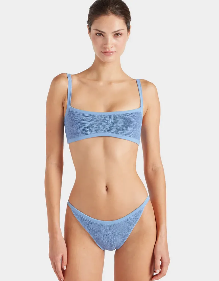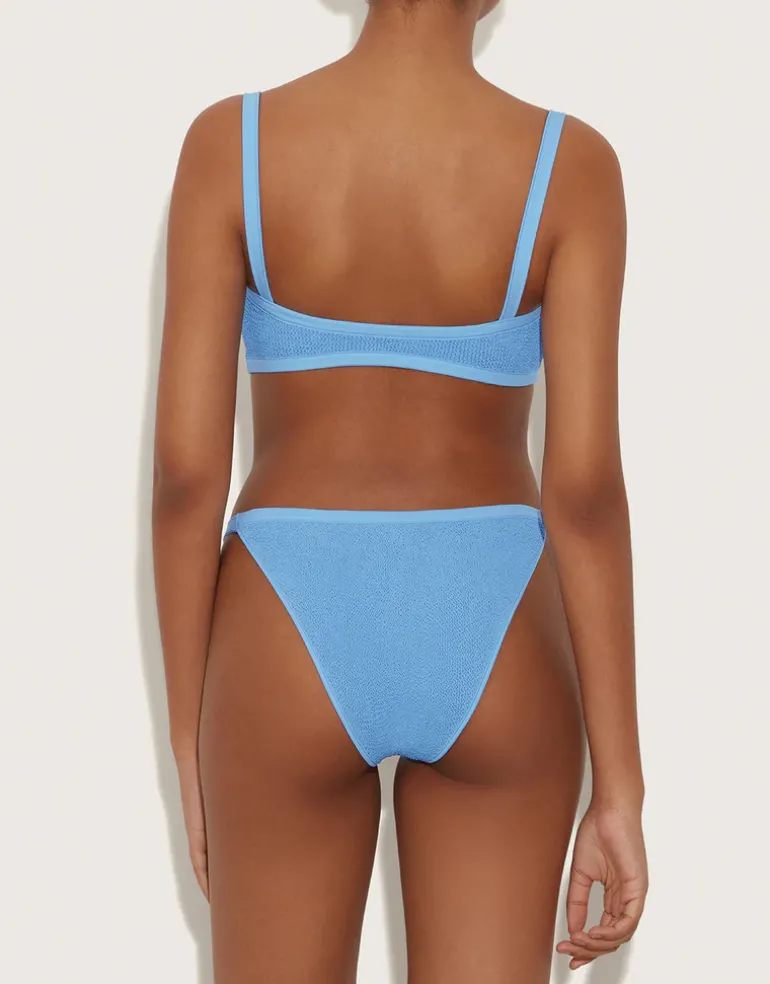 The Tyler bikini set from Hunza G has sleek, 90s appeal with tonal lycra binding and tanga briefs for a sporty look with moderate coverage. Constructed from their ingenious Crinkle fabric which is designed to stretch and sculpt to your body meaning that one size will fit sizes 6 to 16.