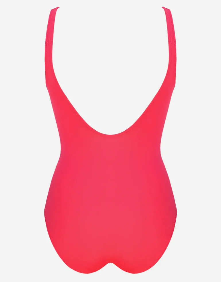 The Uni swimsuit from Charmline’s in this lovely Coral red is a V neck style with moulded foam cups and gathered panels across the front which come together in a vertical rouleau with gold metallic bead detailing.