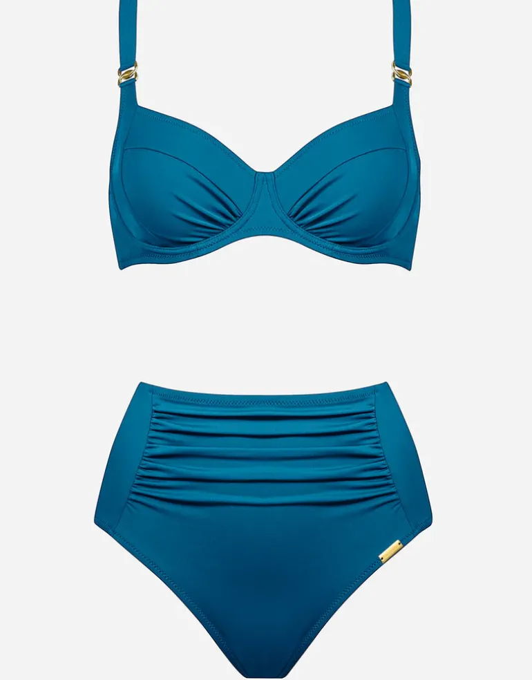 The Uni Underwired bikini set from Charmline is a beautiful Ocean blue colour bikini set elevated by ruching and metallic detailing. The bikini top is underwired, with metallic chain detail on the adjustable straps. The bikini pant is high waisted with a gathered front panel.