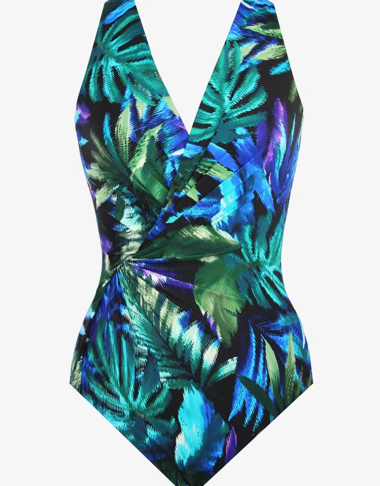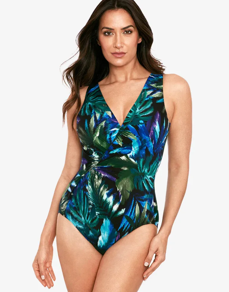 The Useppa Esmerelda swimsuit from Miraclesuit is a lovely underwired style with wide cups and straps for a comfortable fit. The gorgeous bright blue and green tropical Useppa print is wrapped at the front and gathered together at one side for maximum slimming effect.