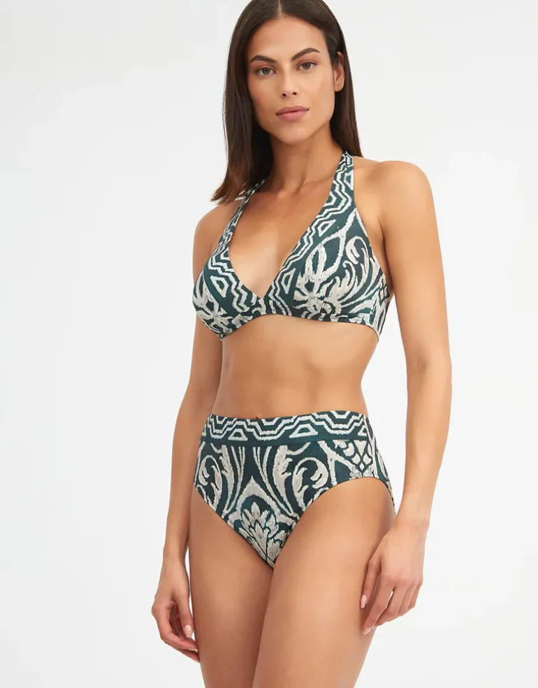The Valeria Plunge bikini top from Nuria Ferrer, in a green and white damask print is a plunge halter style featuring moulded cups for shape and comfortable support.