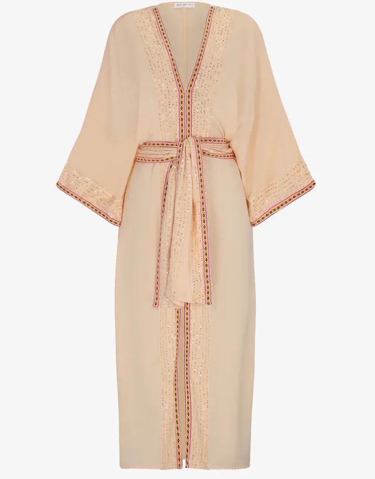 The Vanessa Sequin kimono from Pitusa is a beautiful pale melon coloured style with sequin and Inca weave detailing at the edges and hems. In loose fitting style with wide kimono style sleeves and a sash tie.
