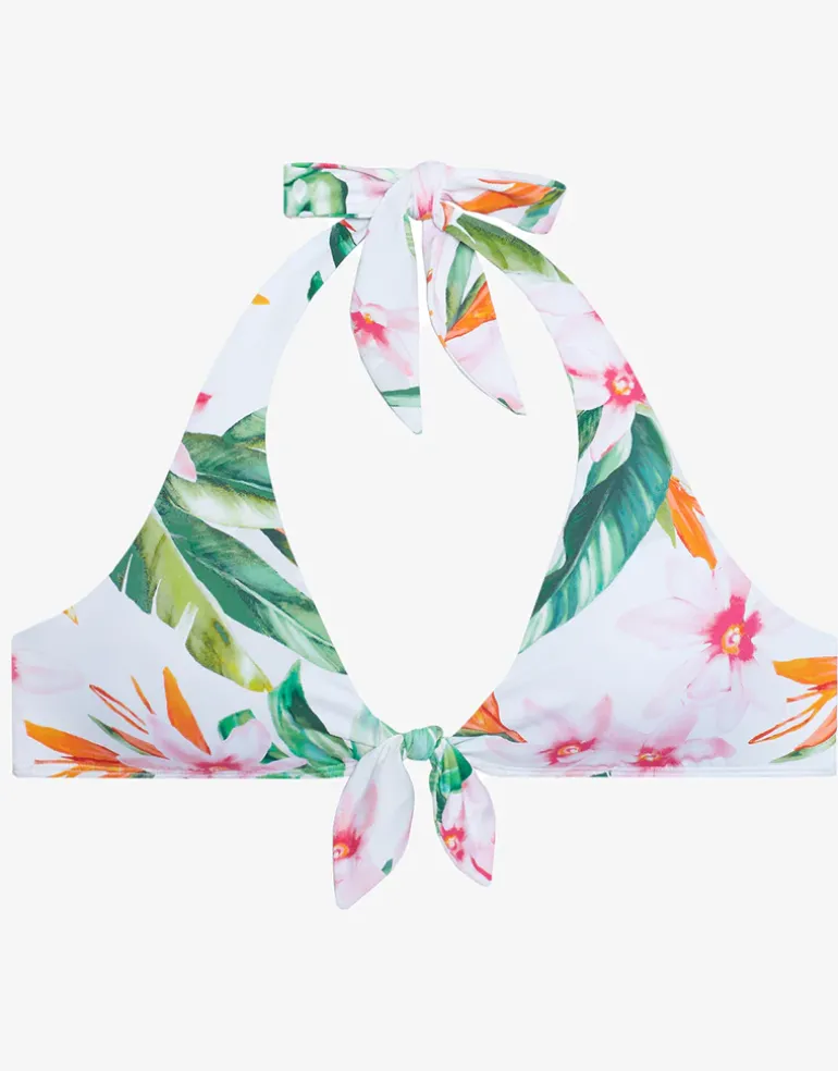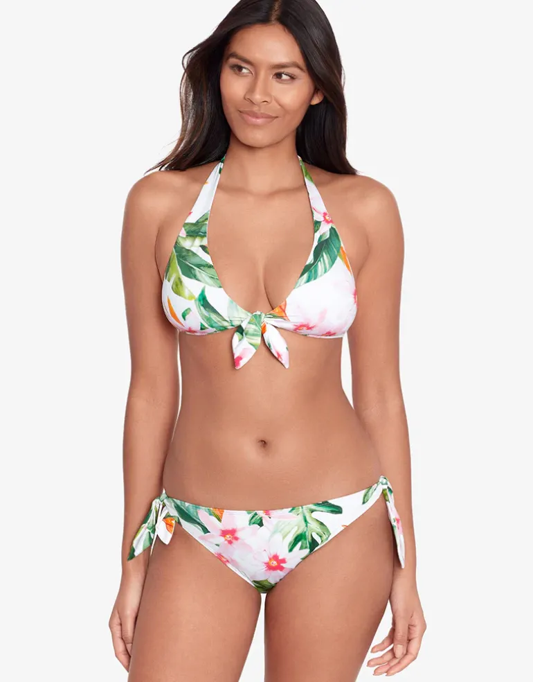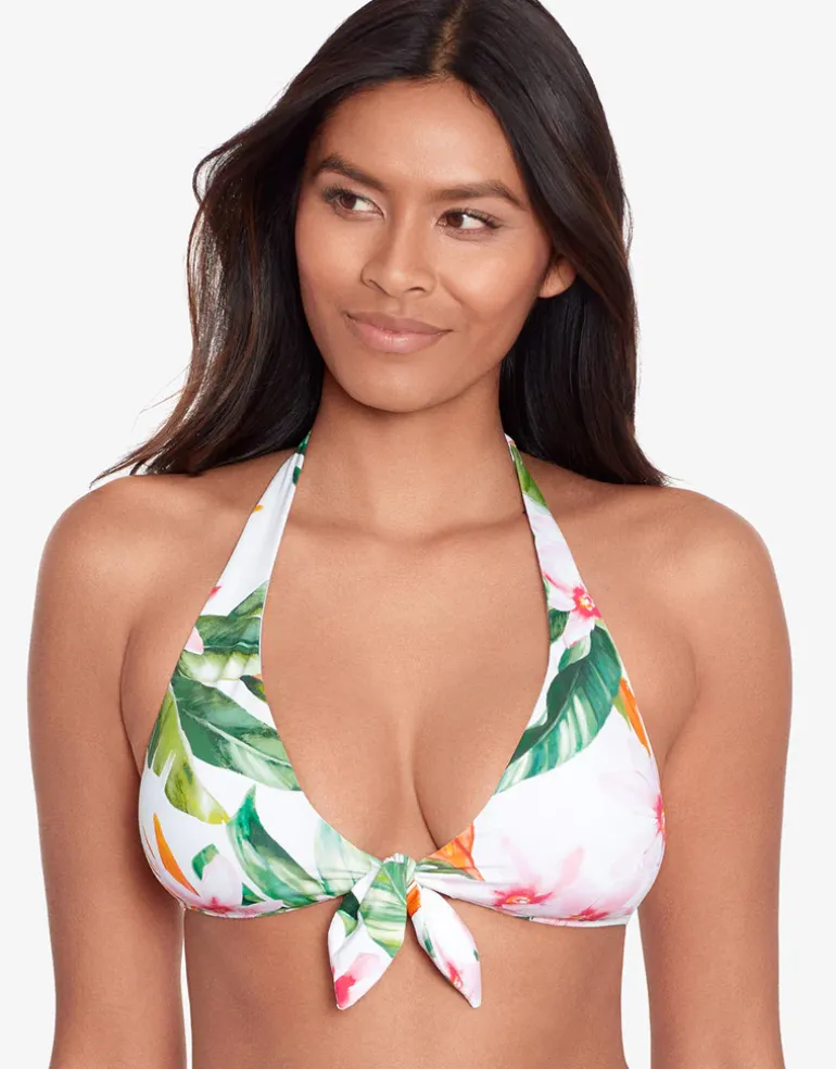 The Watercolour Tropical Tie Front Halter bikini top from Lauren Ralph Lauren showcases a vibrant tropical print of greens, pinks and oranges against a bright white background evoking the essence of summer. This halter-style top features ties at the neck and front, as well as a clip at the back, and comes with removable cups for a customisable fit.