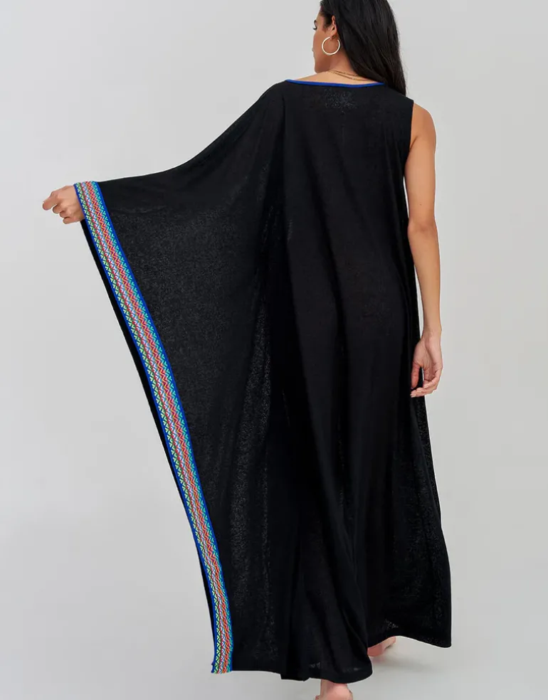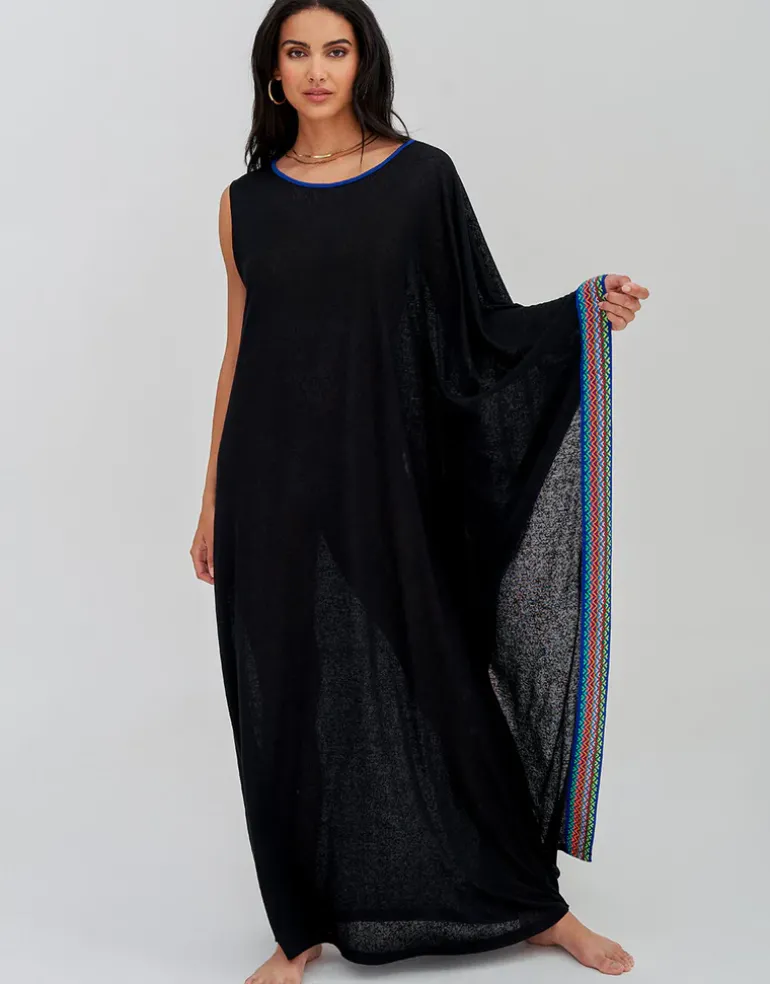 The Waterfall Sleeve dress from Pitusa is a great elegant maxi-length cover-up with a round neck with blue binding and one sleeveless side and one kimono sleeved side, finished with brightly coloured Inca weave detailing. Available in standard and petite sizing; choose standard if you’re over 5ft 4in and petite if you’re under.
