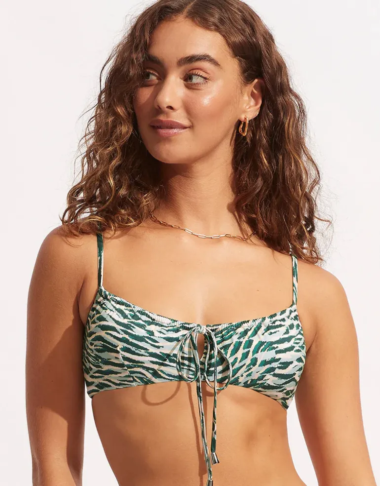 The Wild at Heart Drawstring Bralette bikini top from Seafolly is a pretty bralette style with narrow adjustable straps and a drawstring and tie to adjust the neck line. Inside there are removable cups and the back fixes with a clip.