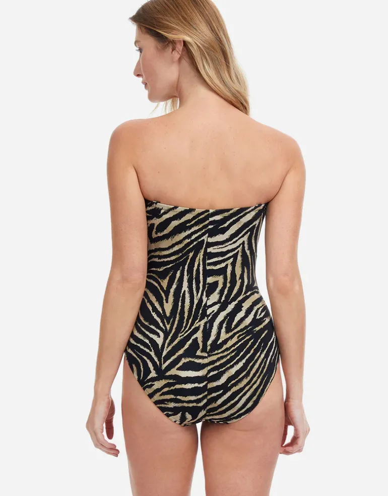 The Wild Life Bandeau swimsuit from Gottex is a super pale gold and black animal print bandeau style swimsuit soft padded cups, optional adjustable straps and tummy control.