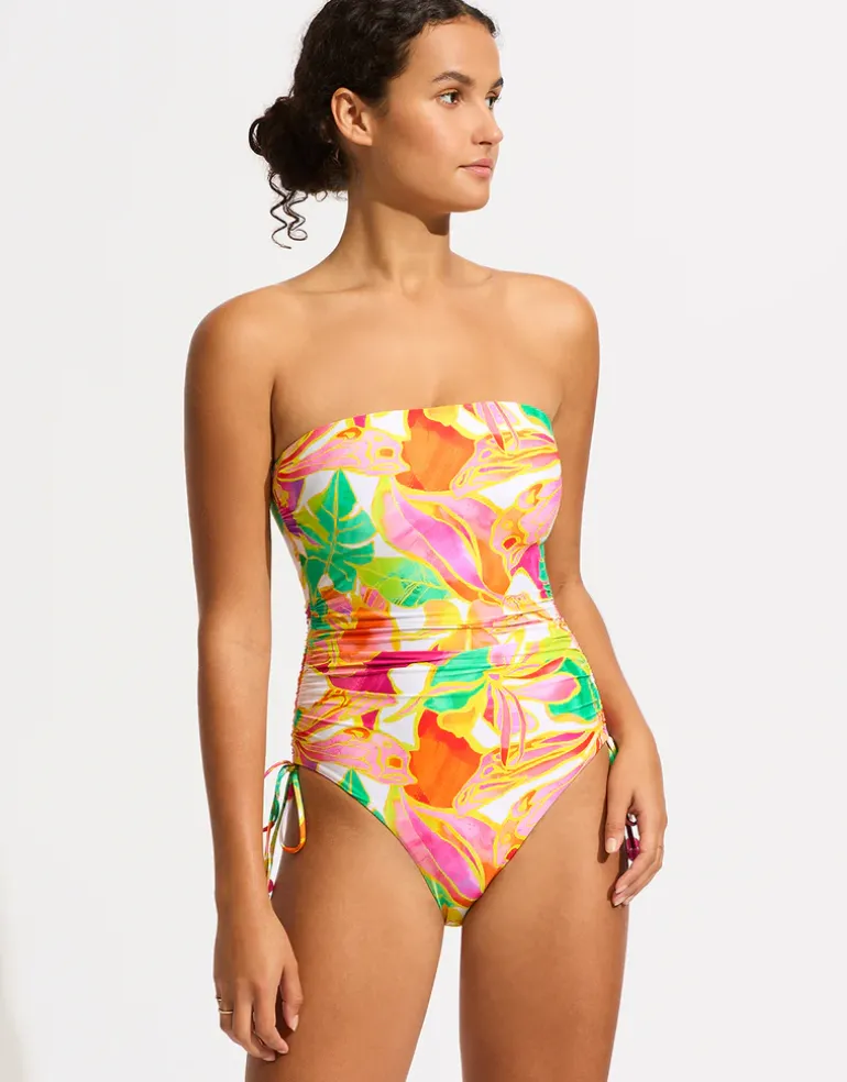 The Wonderland DD Drawstring Bandeau swimsuit from Seafolly is a great bandeau style for larger busts. With hidden underwire, shelf bra and gripper tape for extra support, an optional strap and ties at the hips which can adjust the leg height.