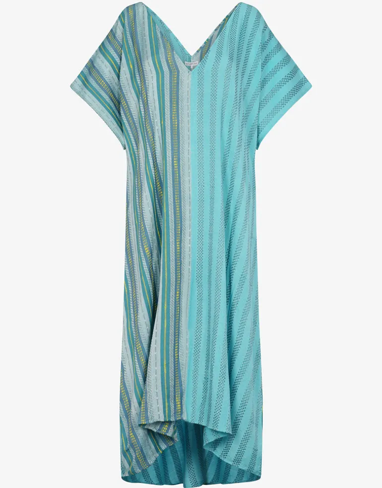 The Yin-Yang Kaftan from Pitusa has a free-flowing, midi-length design featuring a shaped V-neckline and back, along with loose, elbow-length sleeves. With a contrasting print with one side grey and mint blue stripes, while the other features a darker blue and yellow stripe. Finished with a high-low hemline for an effortlessly chic look.
